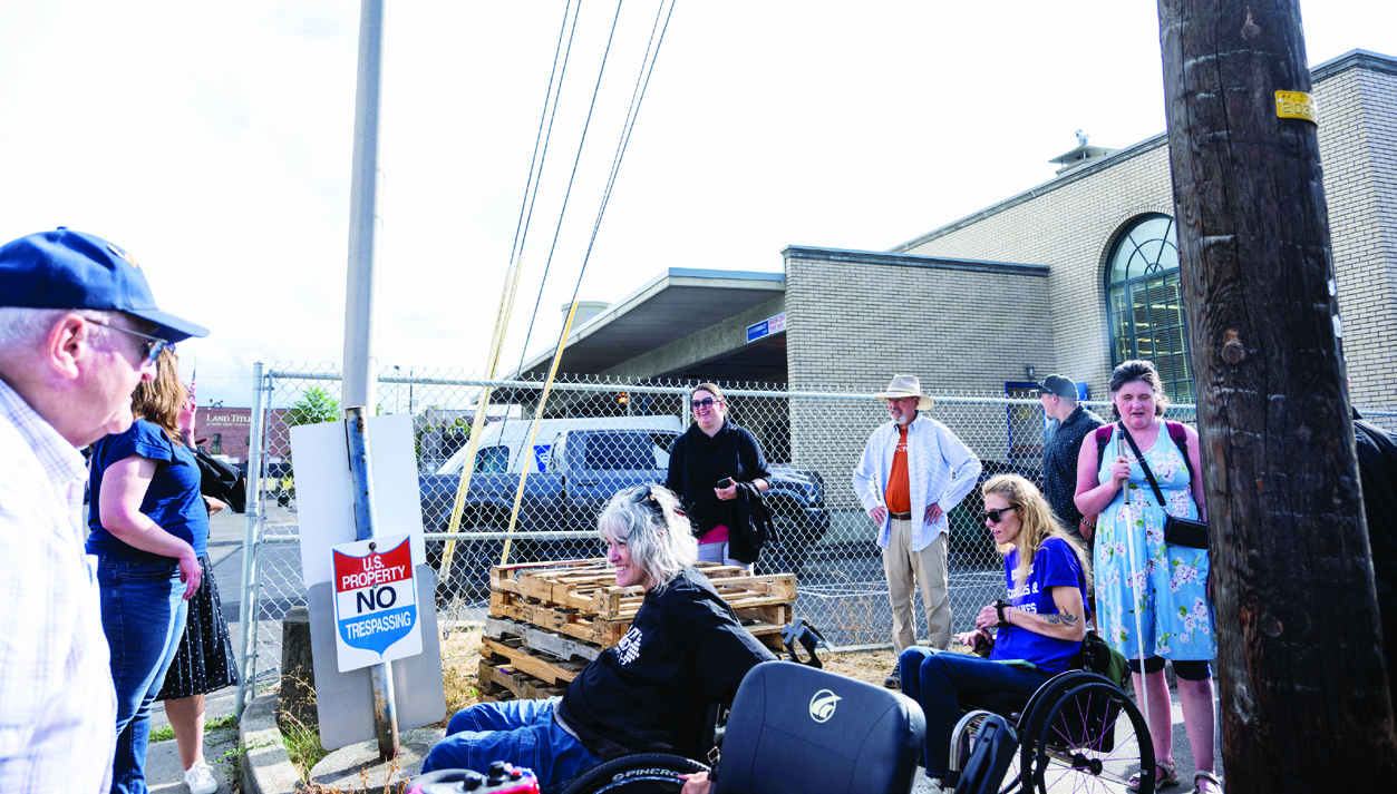 Attendees look at the disability parking spot at the Walla Walla Post office. The disability parking spot is currently being hindered behind a metal fence, with the offloading section blocked by a dumpster and marked by a “US PROPERTY NO TRESPASSING” sign, often causing confusion for disabled drivers.